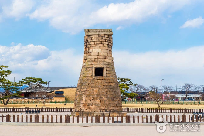 ‘동양 최고(最古)의 천문대’ 첨성대. 신라 제27대 선덕여왕 때 건립된 것으로 추정되며 경주를 상징하는 랜드마크 중 하나이다. 받침대 역할을 하는 기단부(基壇部)위에 술병 모양의 원통부(圓筒部)를 올리고 맨 위에 정(井)자형의 정상부(頂上部)를 얹은 모습으로 높이는 약9m이다. (자료출처 : 대한민국 구석구석 - korean.visitkorea.or.kr)